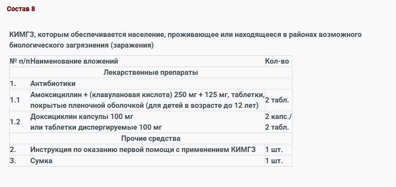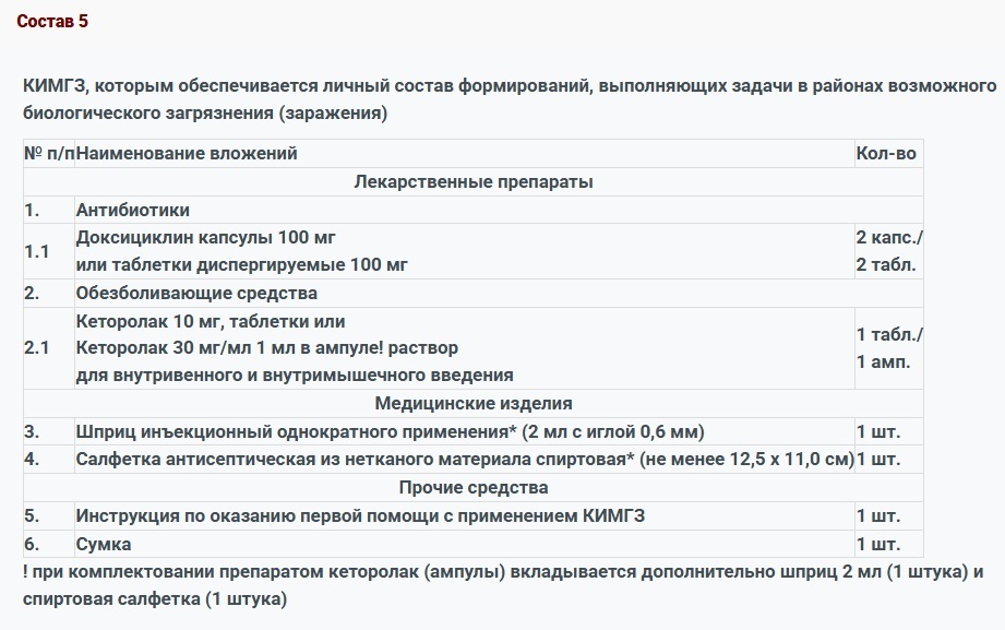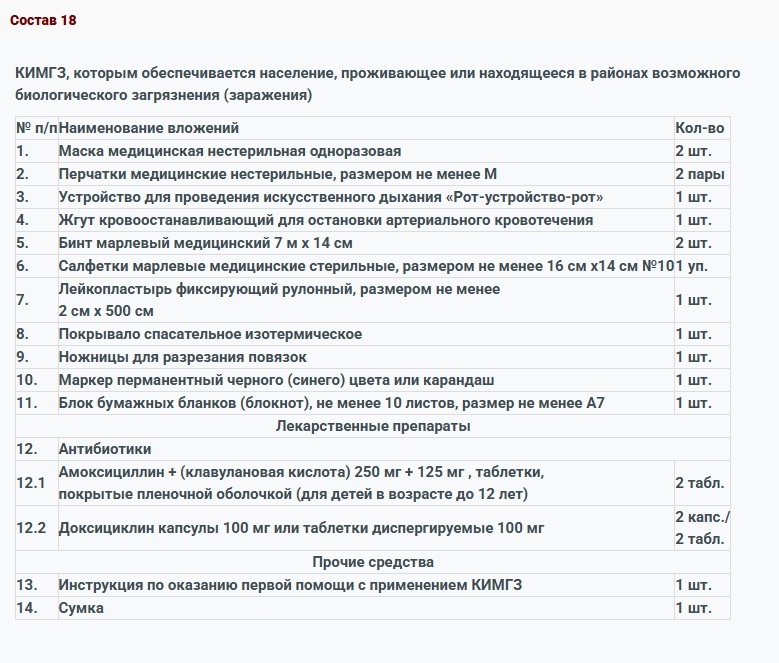 Комплект индивидуальной медицинской гражданской защиты для оказания первичной медико-санитарной помощи и первой помощи (КИМГЗ) КИМГЗ укомплектован в соответствии с приказом Министерства здравоохранения РФ от 28.10.2020 г. № 1164н с изменениями по приказам Министерства здравоохранения РФ №805н от 23.12.2022 г. и №65н от 22.02.2023 г. ТУ 21.20.24-183-10973749-2020